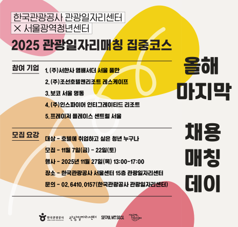 이전 채용정보 드림피앤아이 호텔 담 프런트 담당자 채용의 건 공고등록일 : 2025.12.05 접수마감일 : 2025.12.22 고용형태 : 정규직 모집인원 : 2명 (주)더드림버스 [신규오프/주5일/식대지원] 빅토리녹스 신세계면세점 신규매장 직원 모집 공고등록일 : 2025.12.05 접수마감일 : 채용시까지 고용형태 : 정규직 모집인원 : 2명 종로구청 서울특별시 종로구 지방임기제공무원(관광기획홍보) 채용계획 재공고 공고등록일 : 2025.12.04 접수마감일 : 2025.12.12 고용형태 : 계약직 모집인원 : 1명 (주)로컬로 [주3일/신입·경력] 커뮤니티 기반 여행사, (주)로컬로 마케터 채용 공고등록일 : 2025.11.21 접수마감일 : 2025.12.17 고용형태 : 정규직 모집인원 : 1명 호텔에이치디씨(주) 보코 서울 명동 [IHG Brand/호텔HDC] 보코 서울 명동 부서별 직원 채용 공고등록일 : 2025.11.07 접수마감일 : 채용시까지 고용형태 : 계약직 모집인원 : 10명 (주)서한사 앰배서더서울풀만 호텔 [2025 관광 일자리페스타] 예약부서(Reservation) 신입/경력직원 채용 공고등록일 : 2025.10.23 접수마감일 : 채용시까지 고용형태 : 계약직 모집인원 : 1명 라마다호텔평창 [라마다호텔평창] 예약실 정규직 채용 공고등록일 : 2025.09.29 접수마감일 : 채용시까지 고용형태 : 정규직 모집인원 : 1명 라마다호텔평창 [라마다호텔평창] 식음팀 정규직 채용 공고등록일 : 2025.09.29 접수마감일 : 채용시까지 고용형태 : 정규직 모집인원 : 3명 라마다호텔평창 [라마다호텔평창] 조리팀 정규직 채용 공고등록일 : 2025.09.29 접수마감일 : 채용시까지 고용형태 : 정규직 모집인원 : 3명 라마다호텔평창 [라마다호텔평창] 판촉팀 정직원 채용 공고등록일 : 2025.09.29 접수마감일 : 채용시까지 고용형태 : 정규직 모집인원 : 1명 다음 채용정보 채용정보 더보기 회사명 공고명 ㈜제주항공 제주항공 노무담당 경력사원 채용 (주)신안관광 호텔리베라 청담 조리팀(양식주방) 신입 / 경력직 채용 베스트네트워크(주) 38. CHO(최고인사책임자) [탑티어 글로벌 복합엔터프라이즈] (주)지엠컴 [브랜드 홍보·전시관] 영어 프리젠터 채용 디케이관광개발(주) [홀리데이 인 광주] 호텔 셰프 모집 엠제이씨티(주) [신입/역세권] 인바운드 여행사 필리핀 세일즈 교육신청 1:1컨설팅 취업준비도검사 교육과정 여행업 DX 아카데미 7월 교육 안내 여행업 DX 아카데미&관광 빅데이터 신규 교육안내 청년구직자 대상 2024 우수호텔아카데미 2025 관광산업 채용시장 전망 MICE 기획자 되는 법: 어떤 일을 하고, 어떻게 성장할까? 더보기 새소식 [모집] 제10기 희망달서 SNS 기자단 모집 [이벤트] [한국관광공사] 한국관광 콘텐츠랩 통합 포털 만족도 조사 이벤트 [모집] 제8기 홍성군 SNS 서포터즈 모집 [모집] 2026년 부산관광공사 일반계약직 채용(1차) 공고(제2025-133호) [모집] 2026 포항시 소셜미디어기자단 모집 더보기 이전 인터뷰 다음 인터뷰