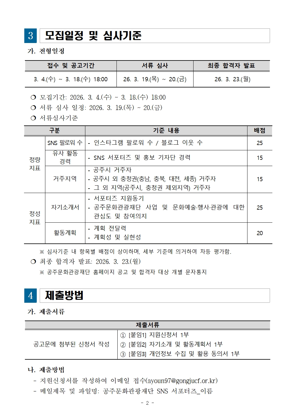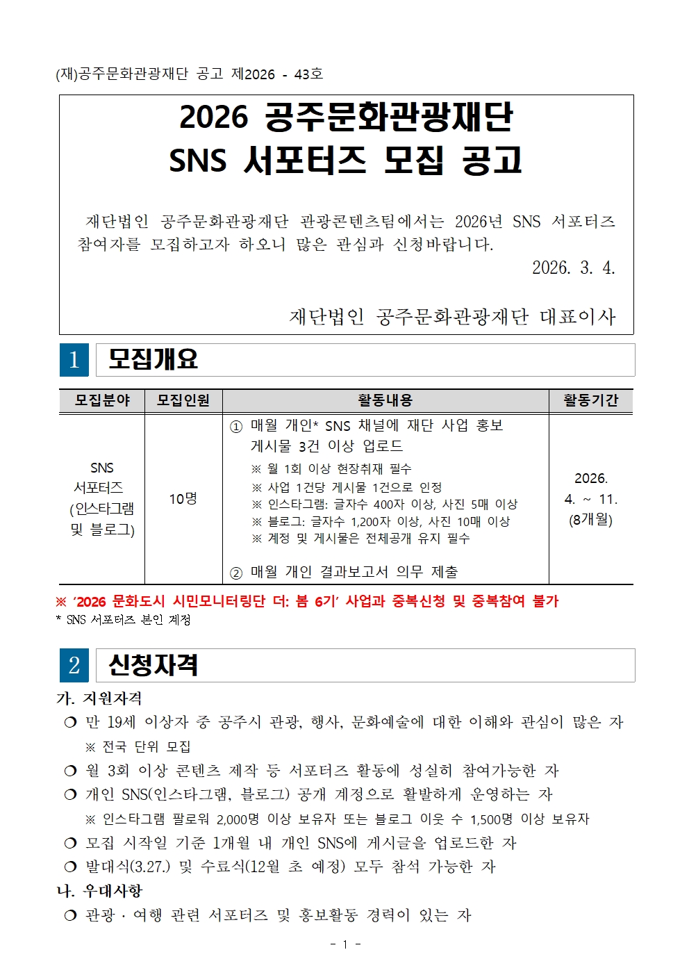 새소식 새소식 현직자 인터뷰 관광일자리박람회 [모집] 2026 공주문화관광재단 SNS 한별서포터즈 새소식 상세보기: 구분, 등록일, 첨부파일, 내용으로 구성 기타 2026-03-10 첨부파일 붙임1. 공주문화관광재단 SNS 한별서포터즈 모집 - 공고문.hwp 붙임2. 공주문화관광재단 SNS 한별서포터즈 모집 - 신청서.hwp 목록
